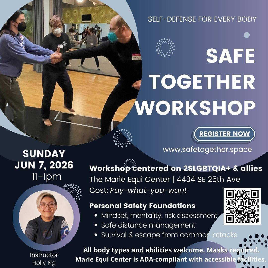 Spend two hours in a safe and inclusive environment learning how to make effective self-defense techniques work naturally with your body. All bodies and all orientations are welcomed, and no prior skill or experience is required. This workshop is centered on the 2SLGBTQIA+ community; allies and friends are also welcomed.